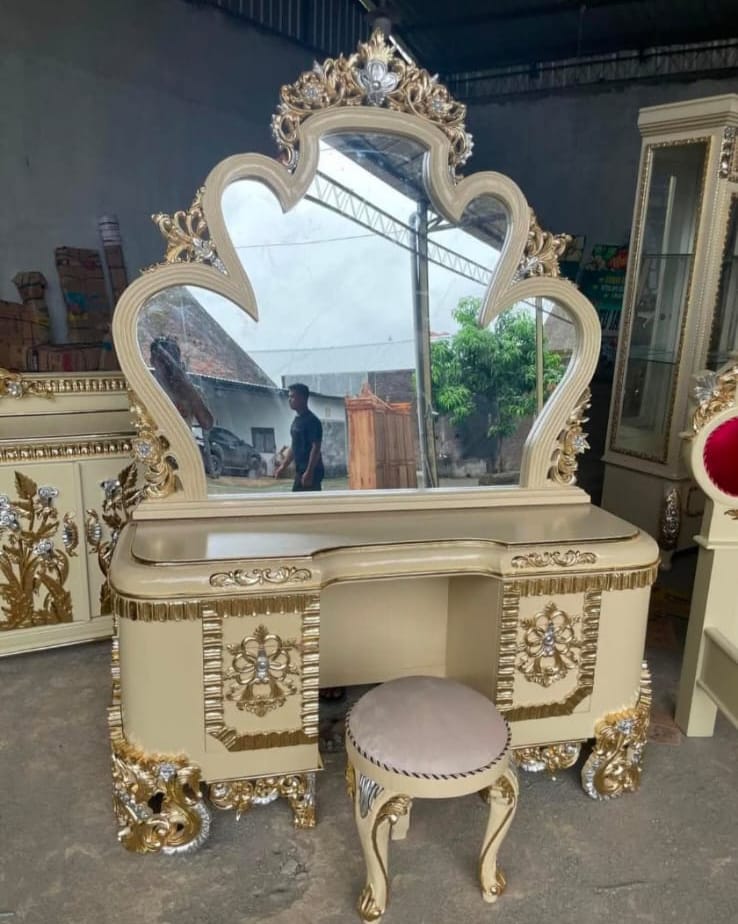 Cermin berbentuk hati yang unik menjadi daya tarik utama dari meja rias ini. Bingkai cermin dihiasi dengan ukiran yang serasi, menciptakan tampilan yang kohesif dan memukau. Meja ini juga dilengkapi dengan bangku kecil yang nyaman, serasi dengan desain keseluruhan, dilapisi kain velvet lembut untuk kenyamanan maksimal.